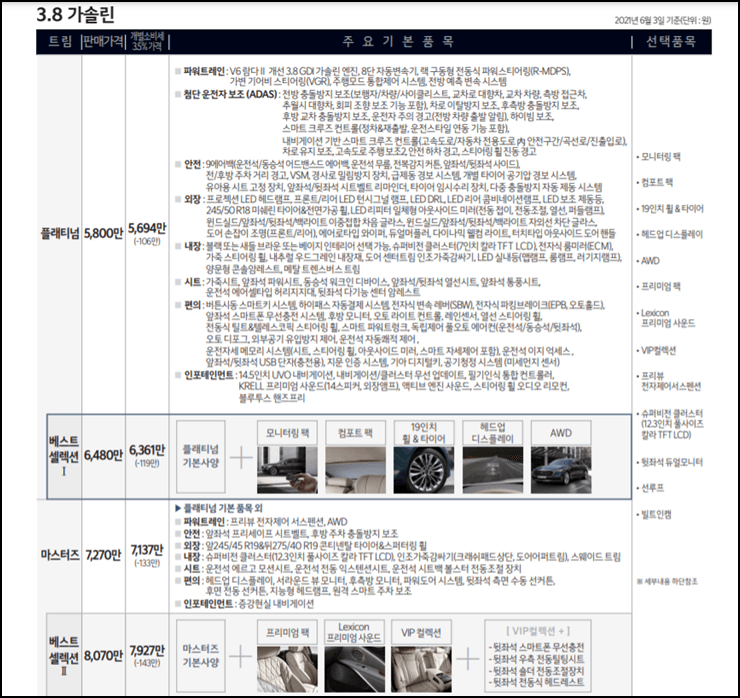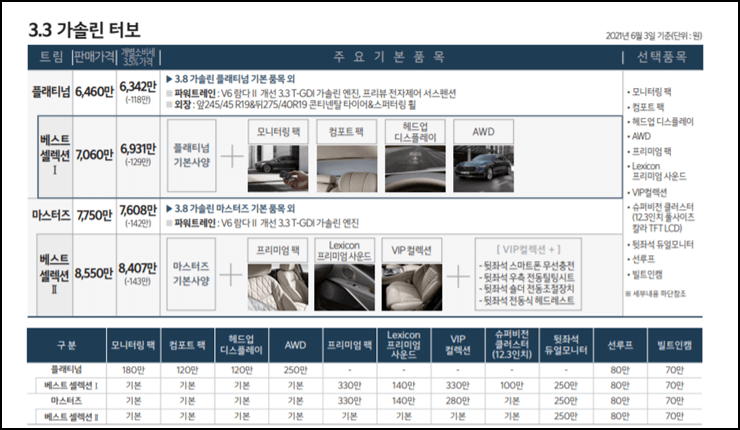 베스트 셀렉션 1은 플래티넘 기본 사양 + 모니터링 팩, 컴포트 팩, 헤드업 디스플레이, AWD입니다.
