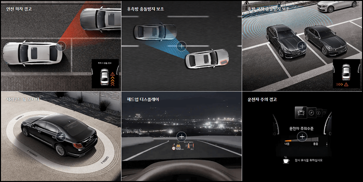 5) 후방 주차충돌 방지 보조 - 주차 시 충돌이 예상되면 운전자에게 경고하고 위험이 높아지면 자동으로 제동까지 도와주는 기술입니다.