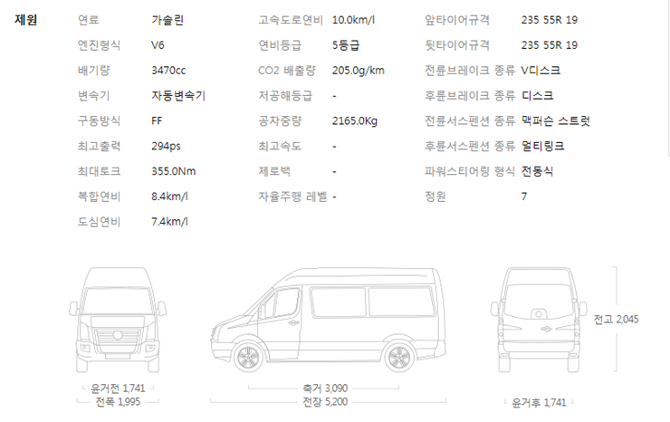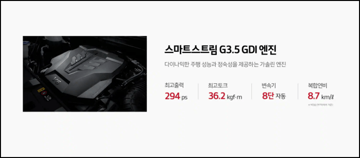 카니발 하이리무진 스마트스트림 G3.5 GDI 엔진입니다. 최고출력 294ps, 최고토크 36.2kgf.m, 8단 자동변속기, 복합연비 8.7km/L 가솔린 엔진이었습니다.