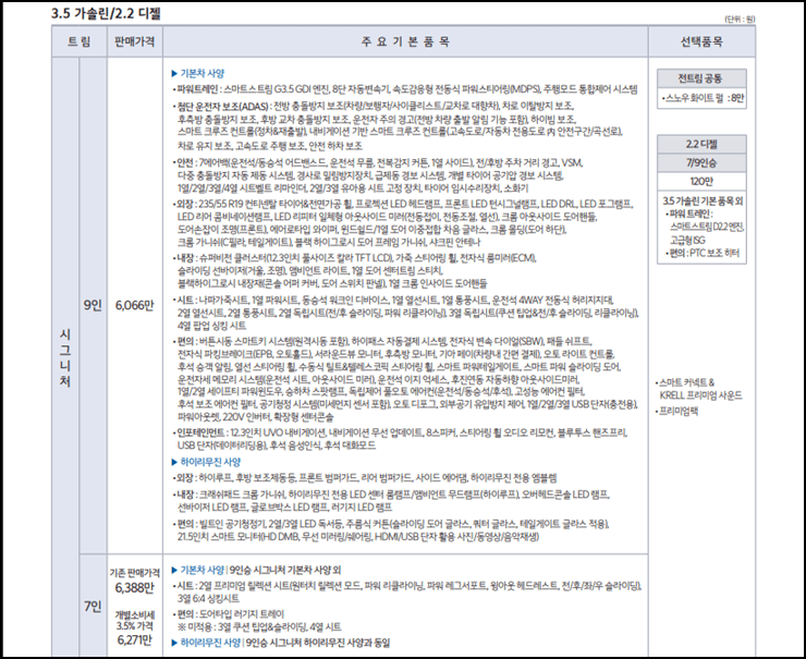 카니발 하이리무진 시그니처 7인 3.5가 솔린/2.2 디젤의 가격은 6271만 원입니다.(개별소비세 적용된 가격)
