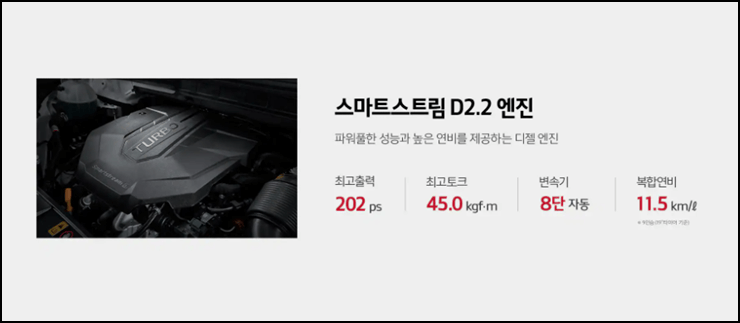 카니발 하이리무진 스마트스트림 D2.2 엔진입니다. 최고출력 202ps, 최고토크 45.0kgf.m, 8단 자동변속기, 복합연비 11.5km/L 디젤 엔진이었습니다.