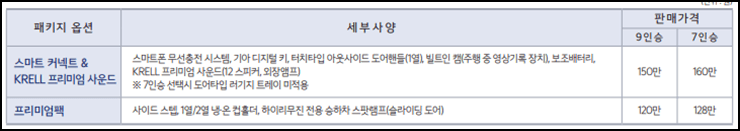 패키지 옵션 내용입니다. 스마트 커넥트 & KRELL 프리미엄 사운드 옵션은 스마트폰 무선충전, 디지털 키, 도어 핸들, 빌트인 캠, 보조배터리, KRELL 프리미엄 사운드(스피커, 외장 엠프) 9인승은 150만 원 추가, 7인승은 160만 원 추가됩니다. 또한 프리미엄팩은 사이드 스텝, 1열/2열 냉온컵홀더, 하이리무진 전용 승하차 스폿 램프(슬라이딩 도어) 옵션이고요 9인승은 120만 원 추가, 7인승은 128만 원 추가됩니다.