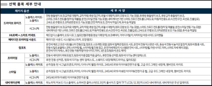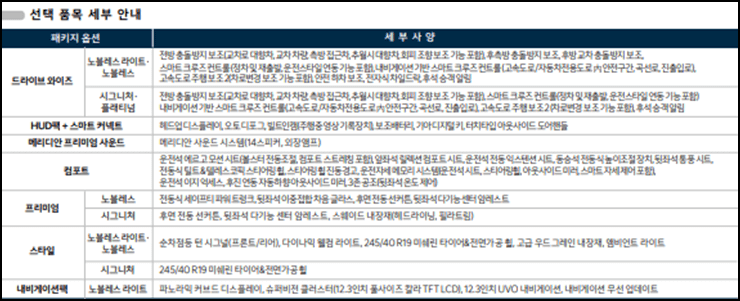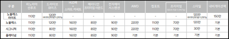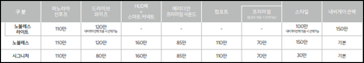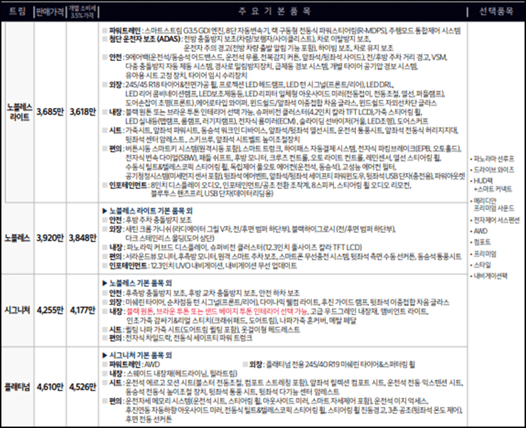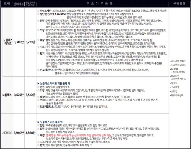 노블레스 라이트는 3340만 원부터, 노블레스는 3575만 원부터, 시그니처는 3940만 원부터 입니다.