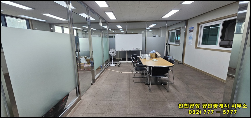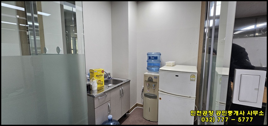 인천 공장 임대 매물의 2층으로 올라가면 화장실과 탕비실 그리고 사무실이 마련되어 있습니다. 34평으로 사무실의 면적이 넓기 때문에 유리 파티션으로 공간을 효율적으로 구분해서 사용하고 있습니다.
