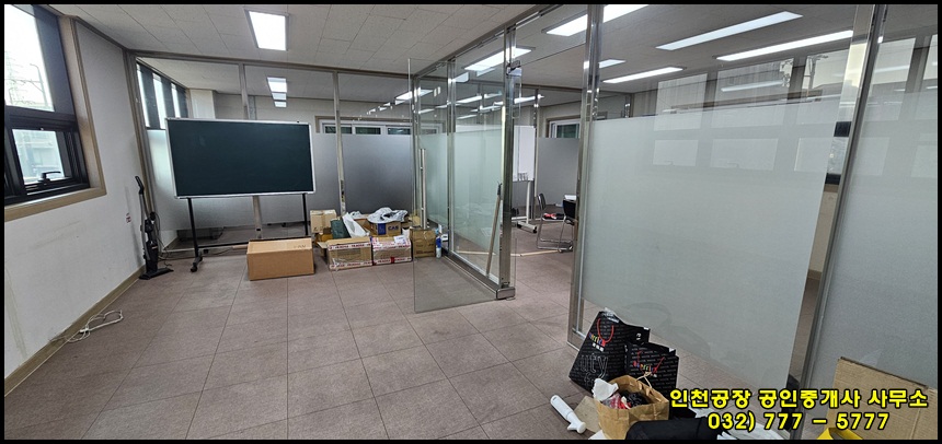 인천 공장 임대 매물의 2층으로 올라가면 화장실과 탕비실 그리고 사무실이 마련되어 있습니다. 34평으로 사무실의 면적이 넓기 때문에 유리 파티션으로 공간을 효율적으로 구분해서 사용하고 있습니다.