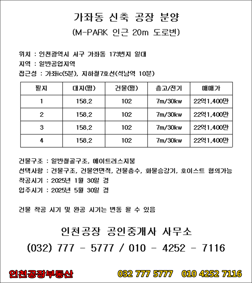 인천 가좌동 신축 공장 매매 현장의 가격표입니다. 가격과 간단한 설명을 포함하고 있으니 참고하시면 될 것 같습니다.