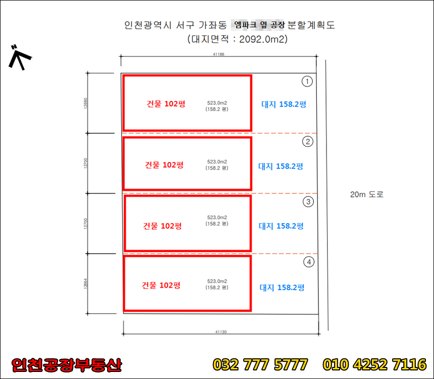 총 633평의 대지를 위의 분할도면처럼 분할해서 매매하는 형태입니다. 현재 한 동은 이미 계약이 되었으니 나머지 3개 동만 남았는데요. 꼭 위의 도면처럼 분할되는 건 아니고 더 넓은 공장을 원하시면 원하는 만큼 협의하에 조절해서 매각할 수 있는 형태입니다. 기존에 나와 있는 인천 소형 공장 매매를 찾는 분들은 기존 공장들의 조금씩 아쉬웠던 부분들 때문에 고민을 하셨을텐데요. 이 곳은 원하는 형태로 만들어 사용할 수 있기 때문에 관심을 가지고 봐주시면 좋겠습니다.