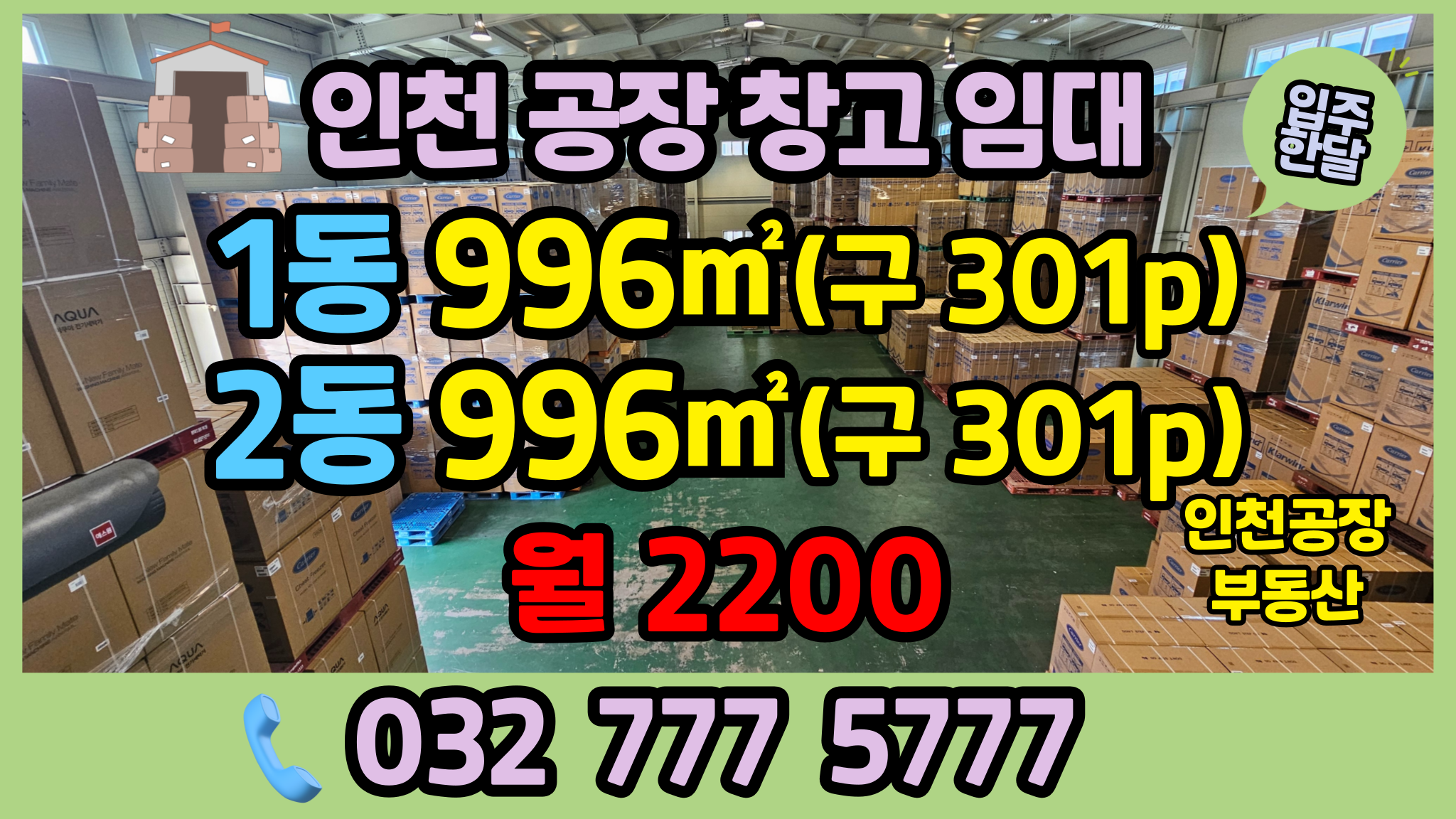 - 인천 물류창고 임대 금액 : A동 임대시 1억 1000/1100(부가세 별도), 통으로 임대 시 2억 2000/2200(부가세 별도)
