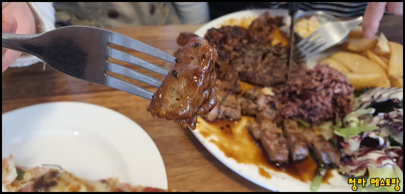 자~드디어 청라 레스토랑 스테이크가 나왔습니다. 우리 은지가 이걸 보더니 환호를 하더군요. 집사람과 저는 서로 눈치를 보며 은지가 눈치를 챌까? 하는 의심의 눈초리로 눈여겨보고 있었는데요. 역시 우리 은지는 모르더라고요. 엄청 맛있다면서 허겁지겁 먹더라고요. 그냥 외식을 하러 나온 게 신이 난 건지 일부러 더 허겁지겁 먹는 모습이 귀여웠습니다.
