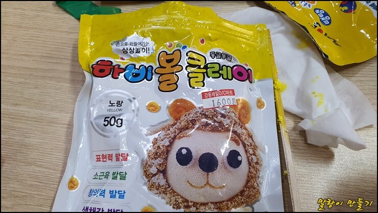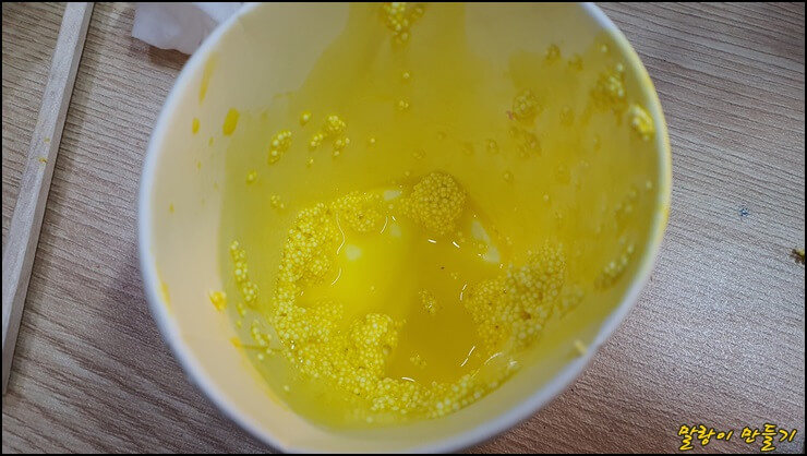 하얀색 아이클레이이와 노란색 하비볼 클레이를 넣고 따뜻한 물을 조금 넣어줍니다.