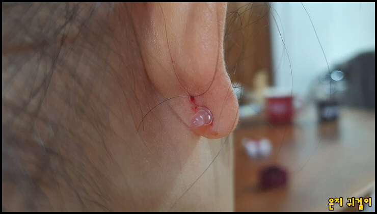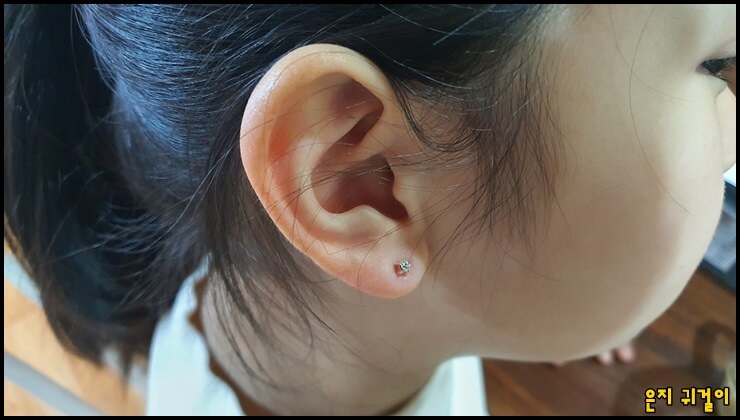 주얼리 가게에는 아주머니와 아저씨가 있었는데요. 아주머니가 아저씨한테 귀 뚫으라고 하더라고요. 그때 아저씨가 약간 당황하는 게 보여서 뭔가 불안 불안하긴 했었는데요. 귀를 한 번에 못 뚫고 두 번에 뚫더라고요 화가 치밀어 올랐지만 어쩔 수 있나요. 큐빅에 박힌 은이 약해서 귀를 못 뚫었다고 하더라고요. 그래도 우리 은지는 씩씩하게 안 아프다고 괜찮다고 하더라고요. 요 녀석 다 컸네요.