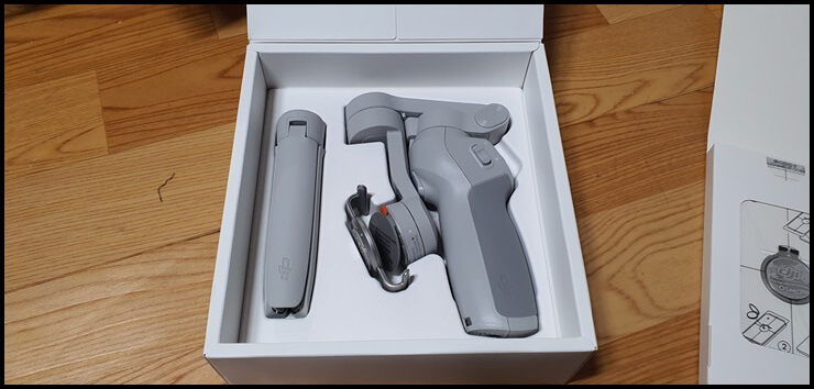 왼쪽은 설명서와 자석을 핸드폰의 정중앙에 붙일 수 있도록 도와주는 가이드입니다. 그리고 오른쪽은 DJI OM4를 들고 다닐 수 있게 해주는 휴대용 주머니입니다. 저거 자석 가운데 붙이는게 중요하다고 하길래 엄청 정성스럽고 조심스럽게 붙였던 기억이 나네요. 저게 가운데에 안 맞으면 수평 수직이 조금씩 틀어져서 매번 조정을 해줘야 한다고 하더라고요. 저는 다행히 가운데에 잘 맞췄습니다.